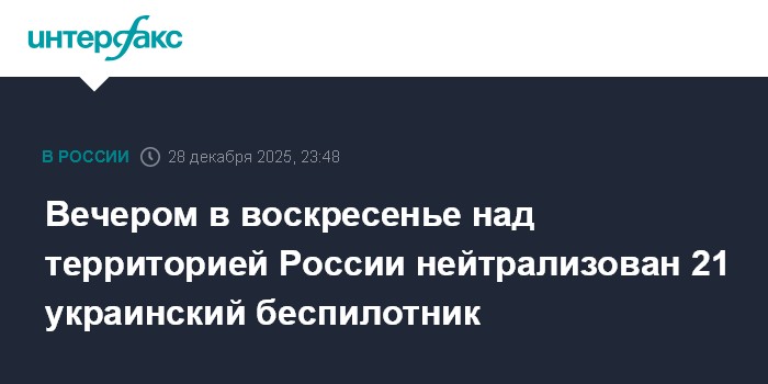 Вечером в воскресенье над территорией России нейтрализован 21 украинский беспилотник