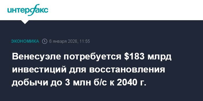 Москва. 6 января. INTERFAX.RU - Венесуэла теоретически может восстановить нефтедобычу до уровней, наблюдавшихся в конце 1990-х годов, но это потребует времени и масштабных вложений, в том числе иностранных, полагают аналитики Rystad Energy.