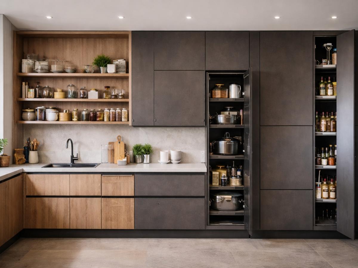 Умные организаторы вместо привычных ящиковНовый подход стал возможен благодаря современным системам хранения. Поворотные механизмы по типу Lazy Susan, выдвижные металлические колонны и многоуровневые корзины позволяют использовать каждый сантиметр пространства.