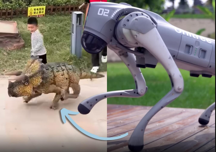 Немного милоты с утра. В Китае в городе Чанчжоу действует «Парк динозавров» с аниматронными фигурами динозавров. Недавно к ним добавили «настоящего» маленького трицератопса, который не просто двигается, а бегает и играет с детьми. Внутри резинового динозаврика спрятана робо-собака Unitree Go2.