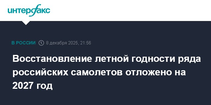 Москва. 8 декабря. INTERFAX.RU - Восстановление летной годности нескольких самолетов российского производства, которое планировалось провести к 2024 году, откладывается на 2027 год, сказано в проекте постановления правительства, подготовленном Минпромторгом РФ и опубликованном на портале проектов правовых актов.