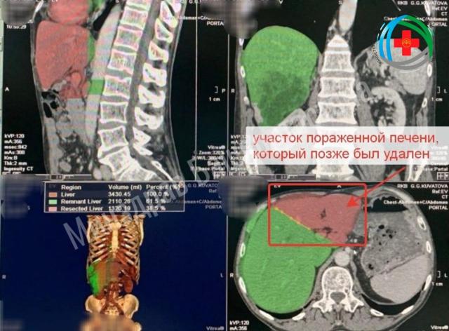 По современной методики врачи выполнили рассечение по границе долей и перевязку воротной вены, которая питала пораженную часть органов. Это помогло активному росту оставшейся здоровой части печени. Через неделю после операции функции печени нормализовались, а через 16 дней ее объем увеличился на 21,4%. После этого пораженную долю операции удалили.