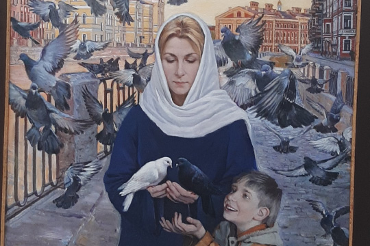 Как прост сюжет картины Людмилы Бирюковой «Радость бытия» и как многозначен он. Мать с сыном на мосту на фоне храма кормят голубей. Мама-то понимает, как важно передать сыну чувство сопричастности и заботы о птицах, о тех, кто рядом, кто наполняет нашу стремительную жизнь незатейливым воркованием и не дает забыть посмотреть на небо, увидеть высокий полет. Мама – образ мадонны, мальчик весь распахнут в тихой радости, но в то же время он под сенью материнских рук, её чистого белоснежного покрова, защиты. Полотно «Радость бытия» можно рассматривать бесконечно, столько в нем символов: и окна - порталы в неведомое, и брусчатка моста - твердь, опора, и сфера, распахнутая крыльями голубей, вольный простор душе в густонаселенном городе.