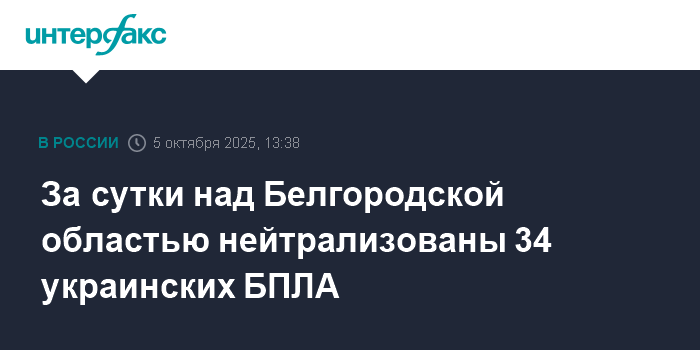 Москва. 5 октября. INTERFAX.RU - Губернатор Белгородской области Вячеслав Гладков сообщил об уничтожении 34 украинских беспилотников подразделениями "БАРС-Белгород" и "Орлан" за минувшие сутки.