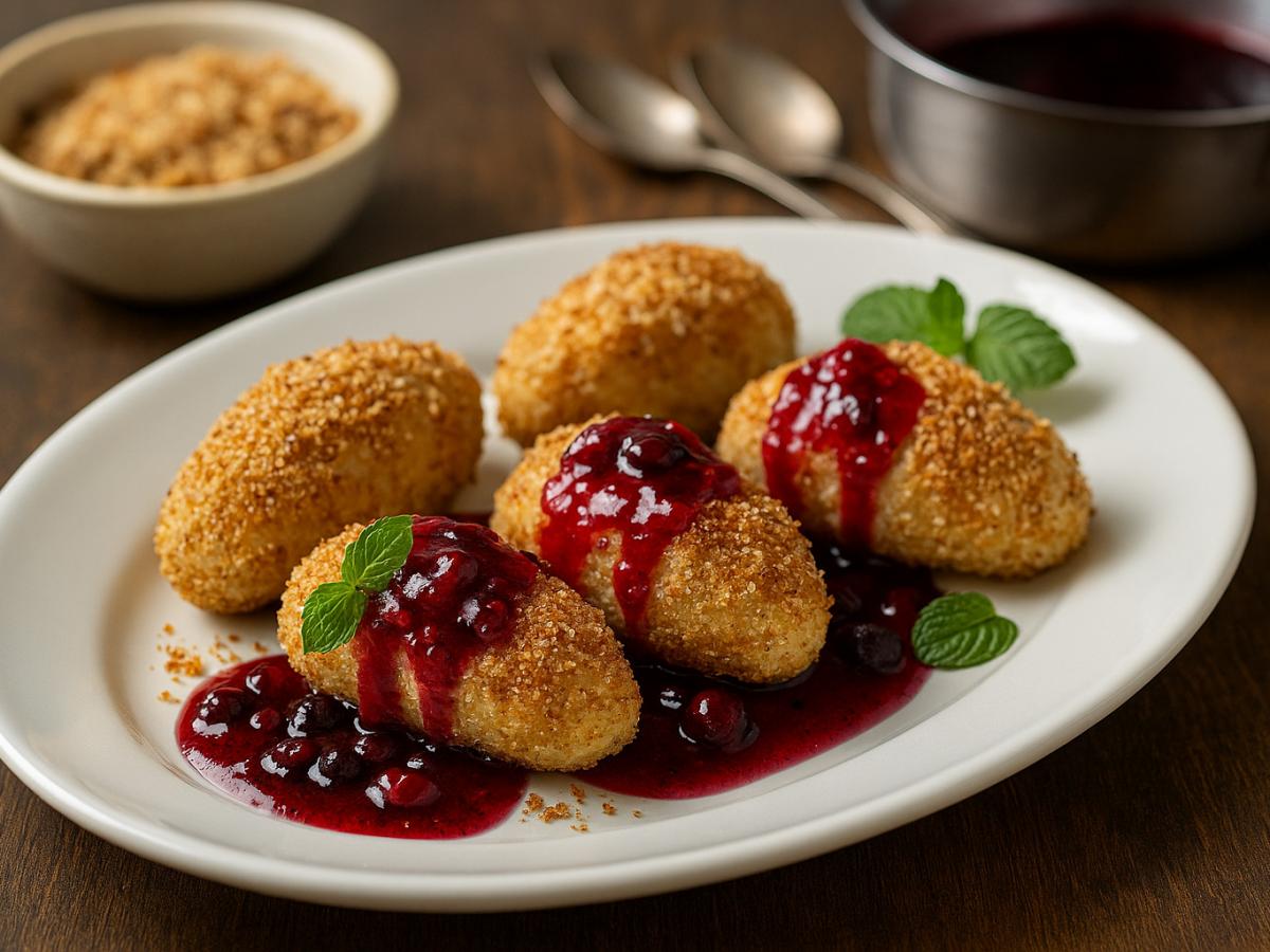 Обжаривание и подачаОбваляйте тёплые кнели в ароматной орехово-сухарной крошке. Разложите на тарелке, полейте тёплым ягодным соусом. По желанию добавьте немного свежей мяты или щепотку сахарной пудры.