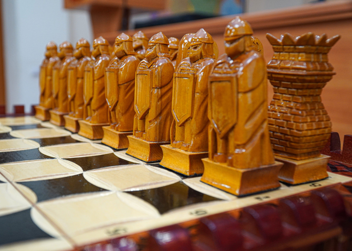 В Кировской области осужденный изготовил необычные шахматы, выполненные в виде крепости с подсветкой. Все фигуры полностью вырезаны из дерева.