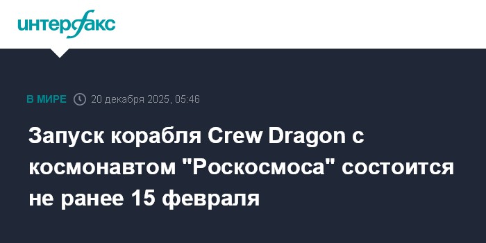 Москва. 20 декабря. INTERFAX.RU - Запуск американского многоразового корабля Crew Dragon компании SpaceX с космонавтом "Роскосмоса" Андреем Федяевым в составе экипажа к Международной космической станции (МКС) планируется не ранее 15 февраля, сообщает NASA в субботу.