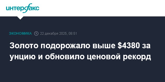 Москва. 22 декабря. INTERFAX.RU - Цена золота на спотовом рынке обновила рекордный максимум, поднявшись выше $4380 за унцию на ожиданиях дальнейшего смягчения денежно-кредитной политики Федеральной резервной системы (ФРС) и нового витка напряженности в отношениях между США и Венесуэлой.