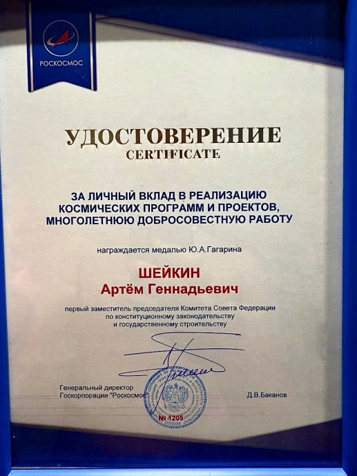 Для меня большая честь получить награду Роскосмоса — медаль имени Ю.А. Гагарина.