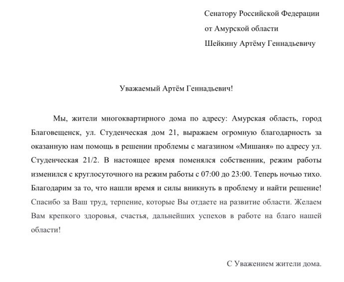 Благодарности от жителей за помощь в решении проблем, всегда приятны, однако тихие и безопасные дворы должны стать нормой, а не исключением из правил. Всем, кто нарушает закон, важно знать: игнорировать его не получится.Если вы знаете места, где торгуют алкоголем, нарушая закон, пожалуйста, сообщите мне на электронную почту AGSheikin@senat.gov.ru