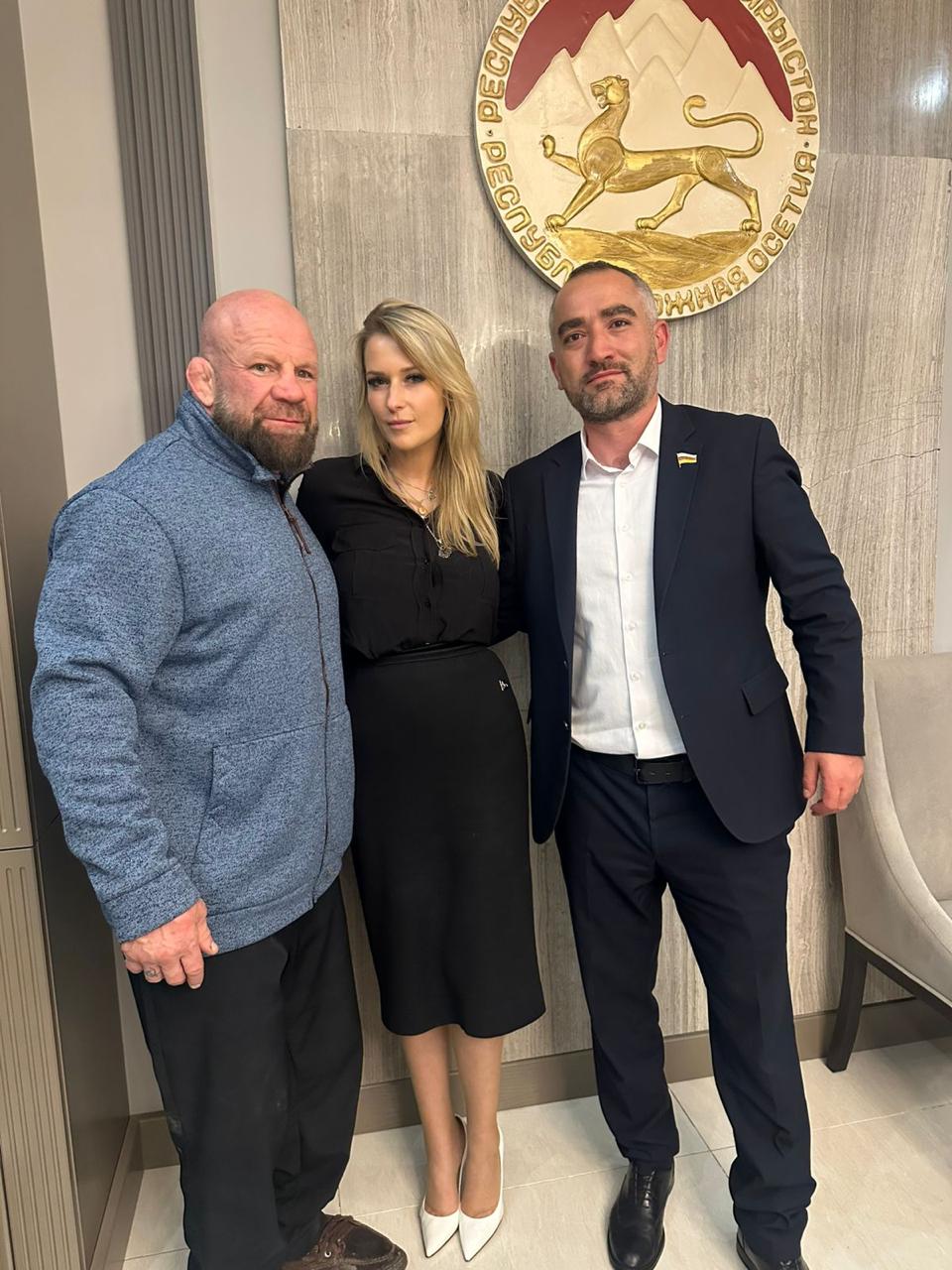 На фото — с председателем Парламента Республики Южная Осетия Аланом Маргиевым и известным американским спортсменом Джеффри Монсоном.