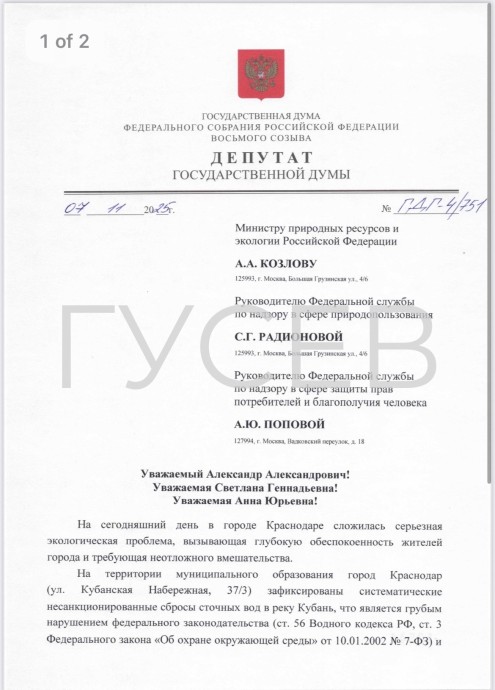 Сегодня направил обращение министру природных ресурсов и экологии России Александру Козлову, руководителям Росприроднадзора и Роспотребнадзора по факту несанкционированных сбросов сточных вод в реку Кубань на территории Краснодара.