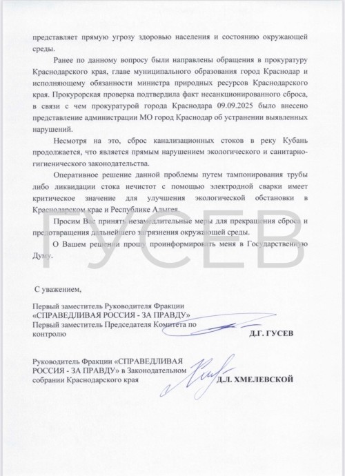Совместно с руководителем фракции «Справедливая Россия» в Законодательном собрании Краснодарского края Денисом Хмелевским мы потребовали незамедлительно принять меры, чтобы прекратить загрязнение и предотвратить дальнейшее ухудшение экологической обстановки.