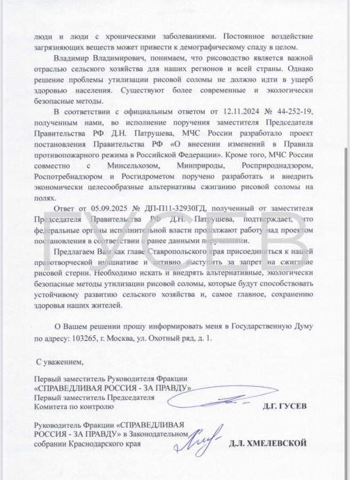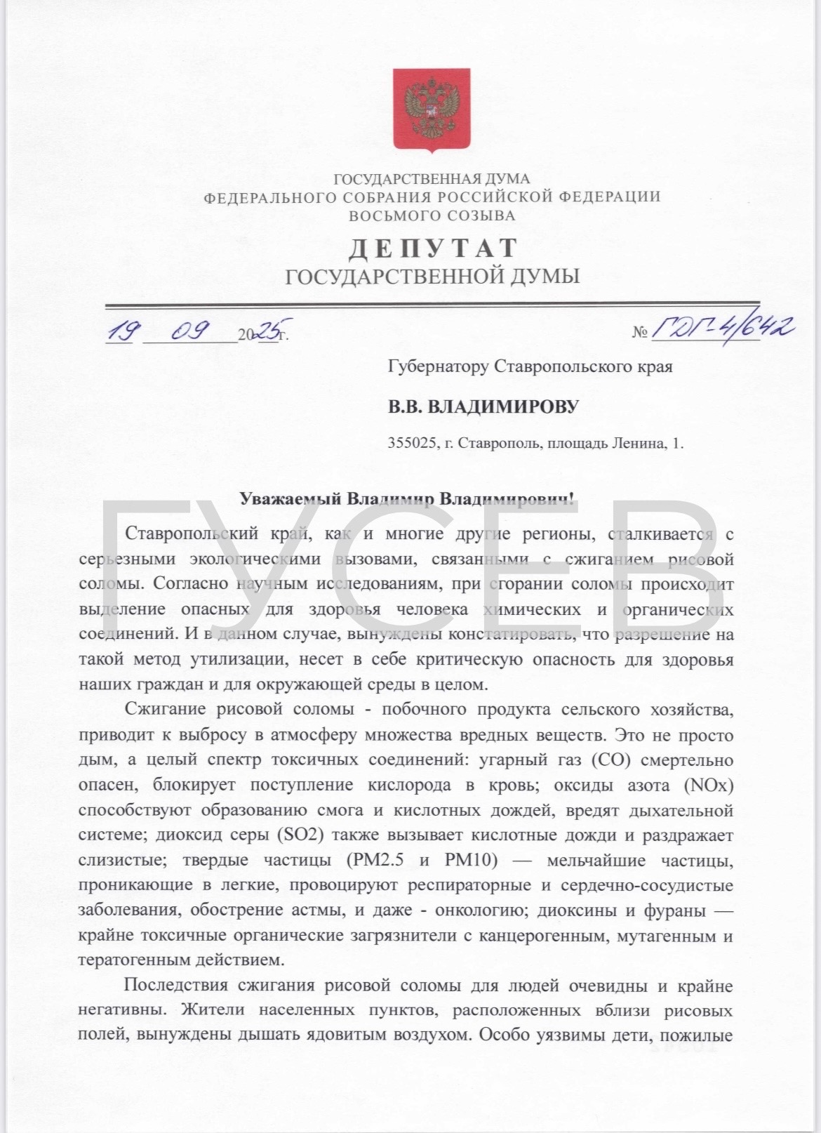 Краснодарский край🟡 Письмо губернатору Ставрополья — требование отказаться от идеи легализовать сжигание рисовой соломы.