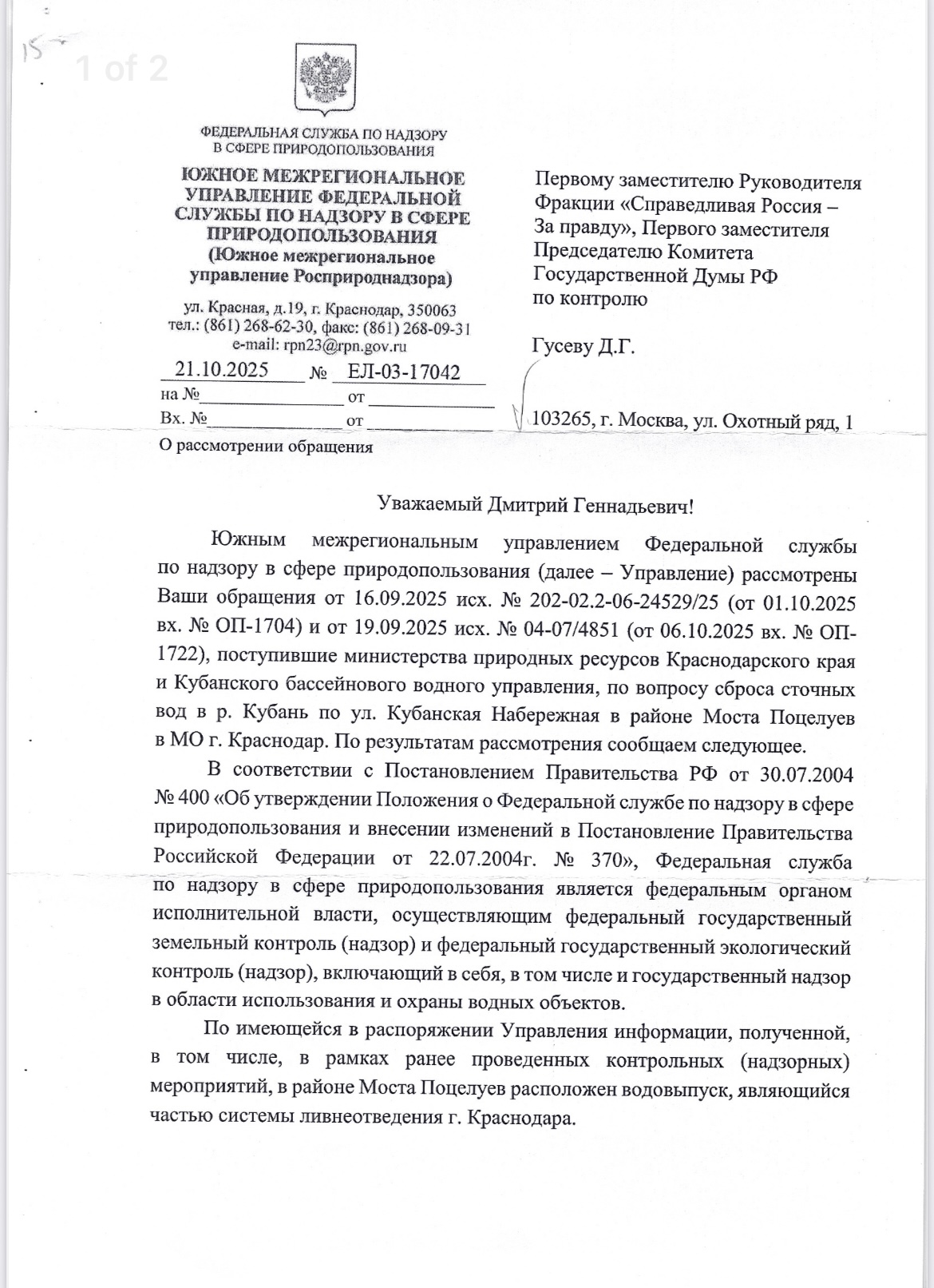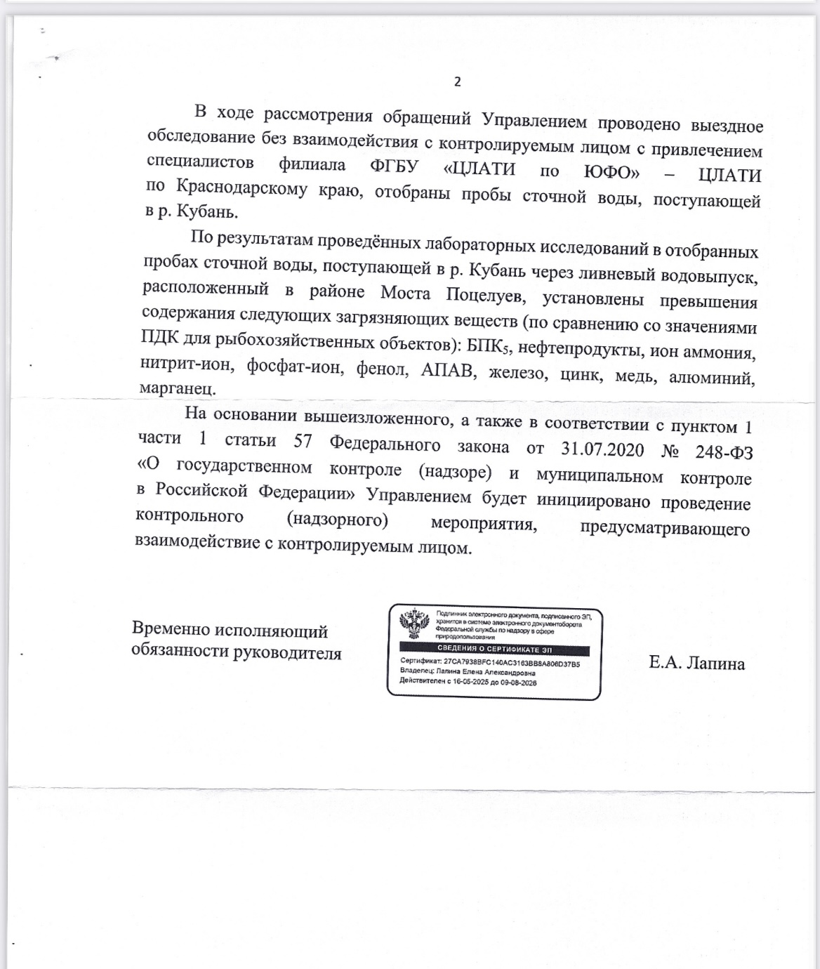 Получил официальный ответ от Южного межрегионального управления Росприроднадзора по фактам несанкционированного сброса сточных вод в реку Кубань в районе Моста Поцелуев в Краснодаре.