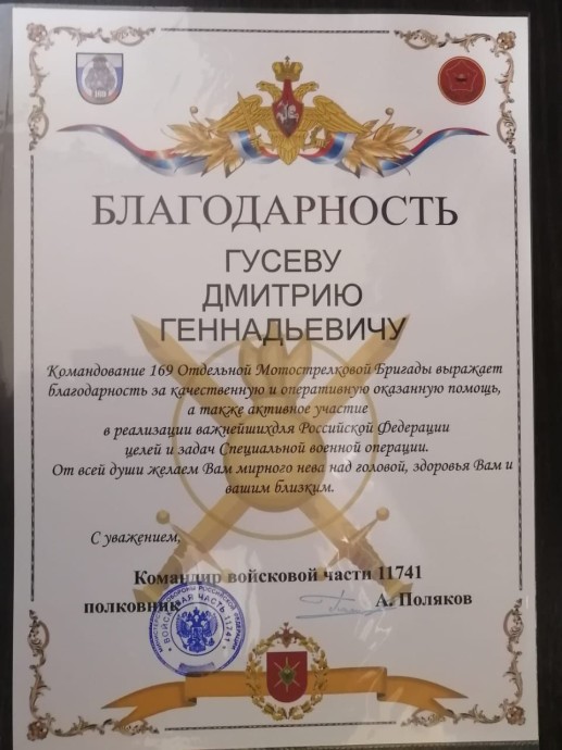 Получил благодарность от командования 169-й Отдельной мотострелковой бригады. Для меня это большая честь — помогать тем, кто ежедневно рискует жизнью, защищая нашу страну и выполняя задачи СВО.
