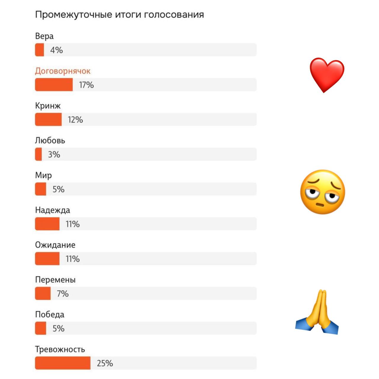 Аутсайдер голосования — слово «любовь», которое набрало всего 3%. Всего в голосовании участвуют 10 слов.