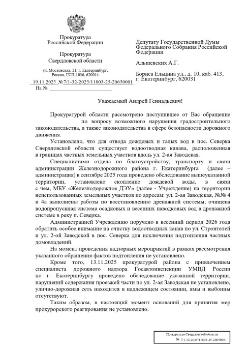 За минувший год направлял несколько запросов в связи с подтоплением частного сектора в поселке Северка Екатеринбурга – дренажные канавы либо не чистились, либо оказались разрушены.