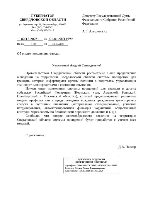 Получил ответ от Дениса Паслера. Губернатор пообещал, что инициативу проработают.