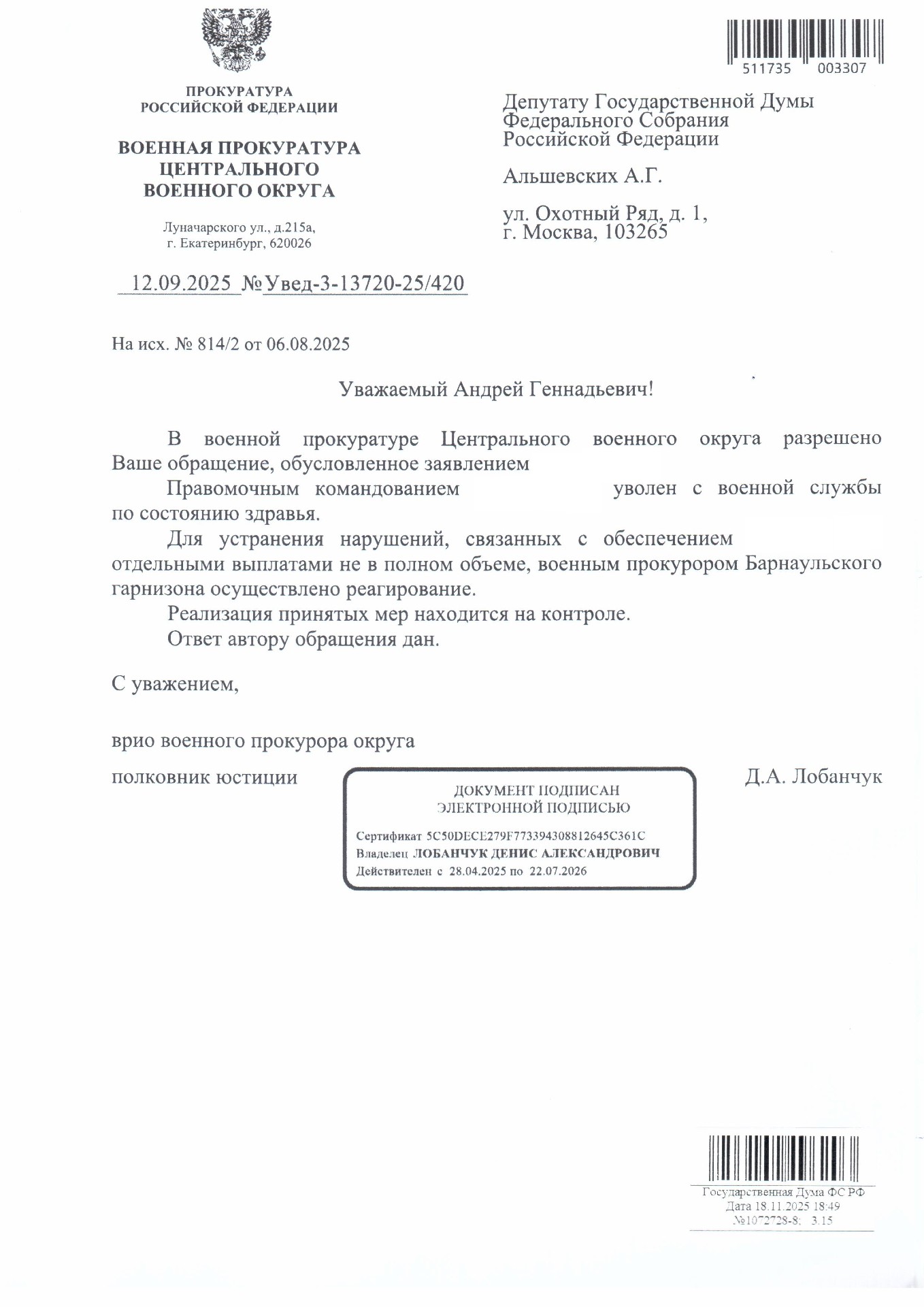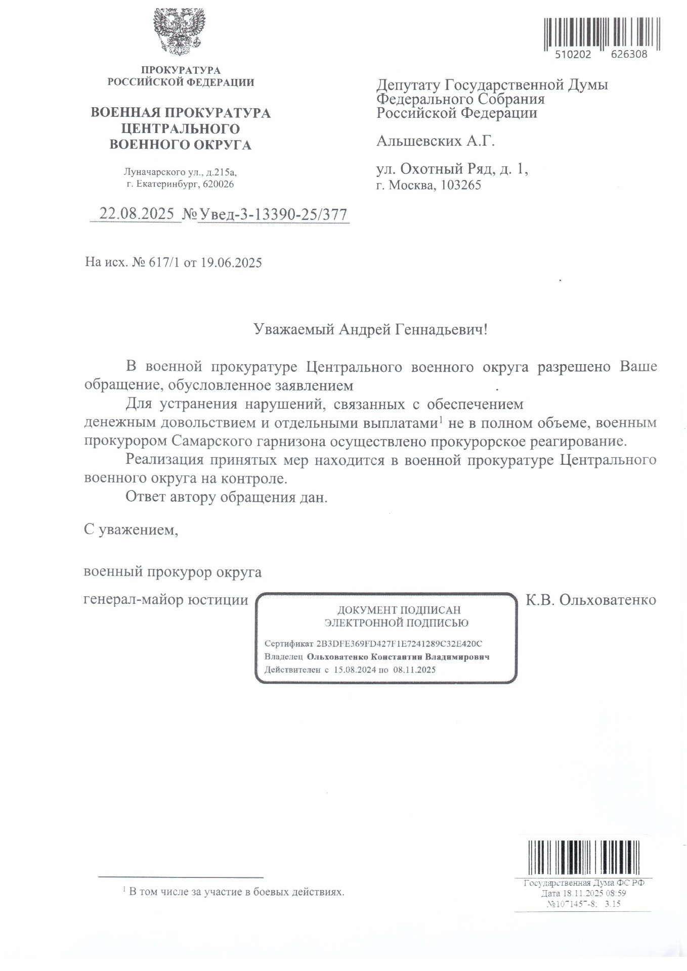 В ответ органы власти должны зорко следить, чтобы каждый военнослужащих получил по праву свое – достойные выплаты, меры соцподдержки, заслуженный отпуск.