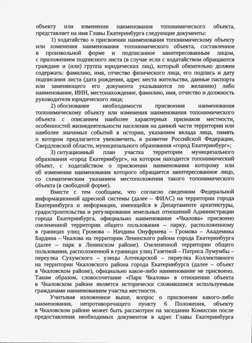 Пожилая женщина, которой за 80 лет, из добрых побуждений обратила внимание на нелогичность в топонимике: в городе существуют два парка имени Валерия Павловича Чкалова. Скромно предложила один переименовать – ради ясности и из уважения к исторической памяти.