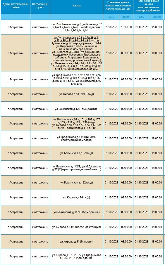 1 октября массово отключат свет жителям Астрахани и ряда сел