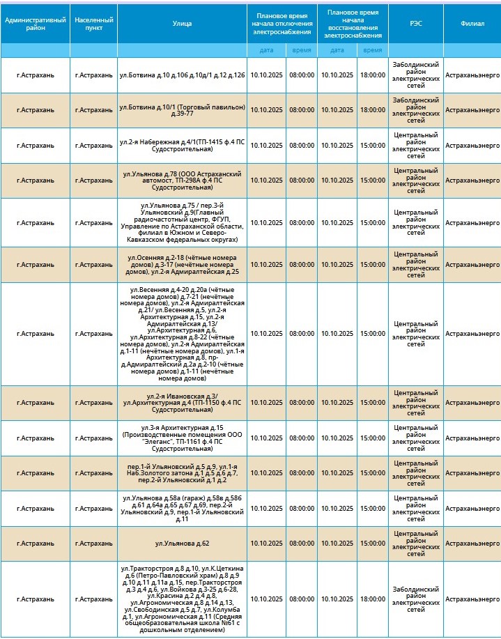 Массовые перебои в электроснабжении продолжатся и в пятницу. 10 октября отключение света коснется нескольких населенных пунктов Астраханской области. Astrakhanpost.ru выяснил, какие из них попали в список «счастливчиков».