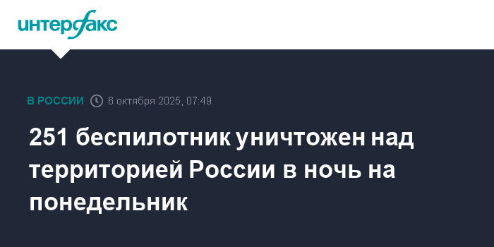 251 беспилотник уничтожен над территорией России в ночь на понедельник
