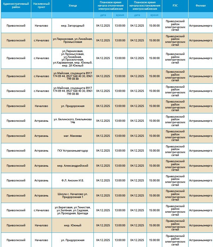 4 декабря массово отключат свет в Астрахани и ряде сел