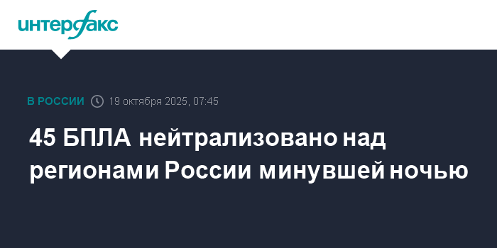 Москва. 19 октября. INTERFAX.RU - Российские военные в ночь на воскресенье подавили и уничтожили 45 беспилотников ВСУ над 12 регионами России, сообщили в Минобороны РФ.