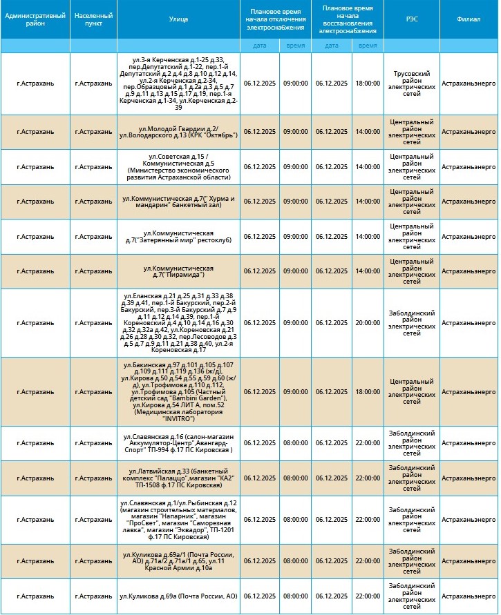 6 декабря массово отключат свет некоторым жителям Астрахани