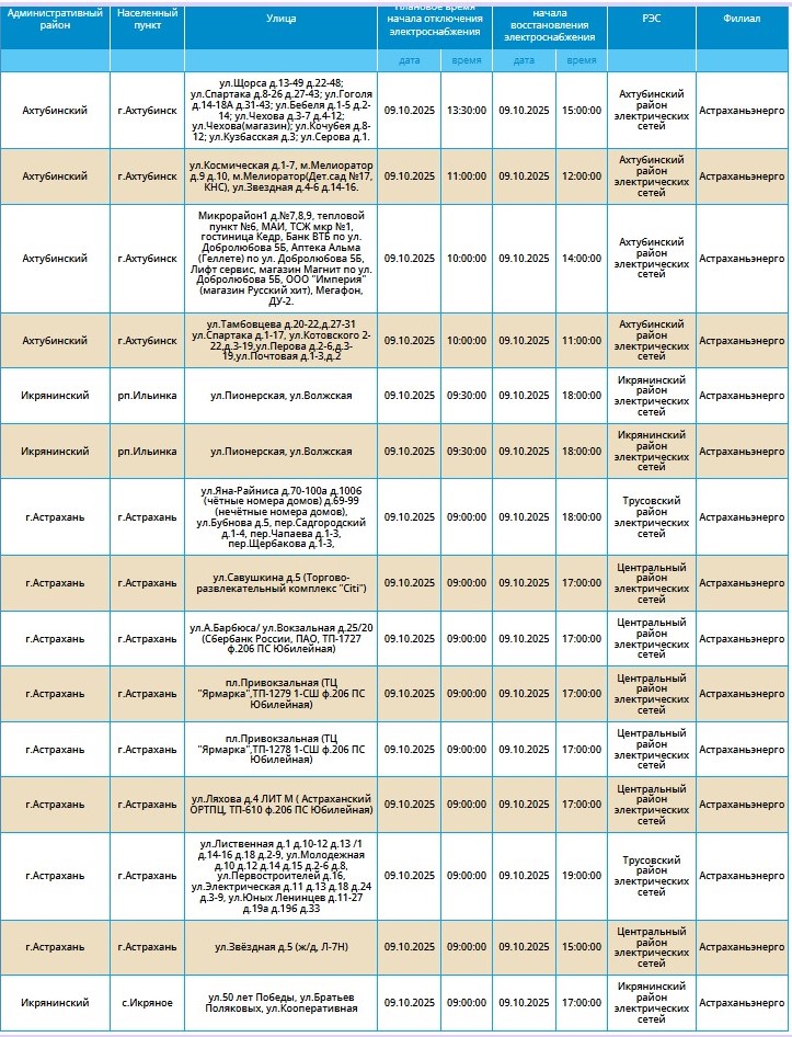 9 октября массовое отключение света коснется Астрахани и трех райцентров