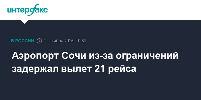 Москва. 7 октября. INTERFAX.RU - Международный аэропорт Сочи в связи со введенными утром ограничениями задерживает вылет уже 21 рейса, сообщает телеграм-канал аэропорта.