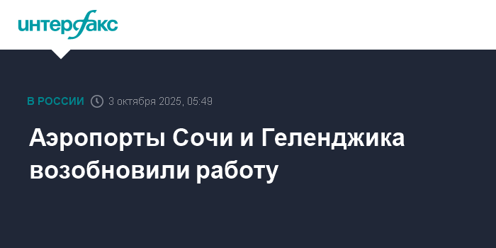 Москва. 3 октября. INTERFAX.RU - Ограничения на прием и выпуск воздушных судов сняты в аэропортах Сочи и Геленджика, сообщил представитель Росавиации Артем Кореняко в своем телеграм-канале в пятницу.