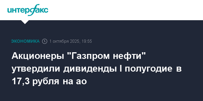 Москва. 1 октября. INTERFAX.RU - Акционеры "Газпром нефти" утвердили выплату дивидендов за первое полугодие текущего года в размере 17,3 рубля на акцию, сообщила нефтяная компания.
