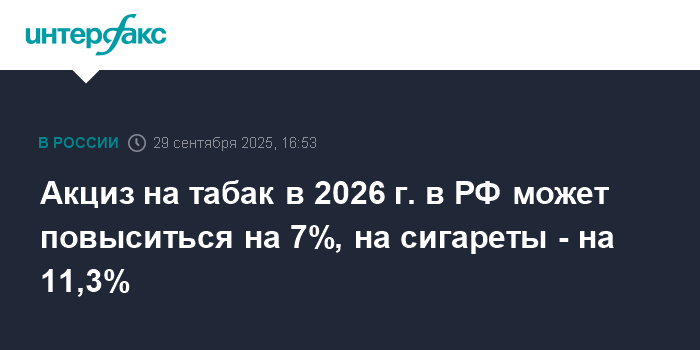 Москва. 29 сентября. INTERFAX.RU - Акциз на табак (трубочный, курительный, жевательный, сосательный, нюхательный, кальянный) в 2026 году по сравнению с 2025 годом может вырасти на 7%, на сигареты - на 11,3%. Это следует из внесенного правительством РФ в Госдуму законопроекта об изменениях в Налоговый кодекс.