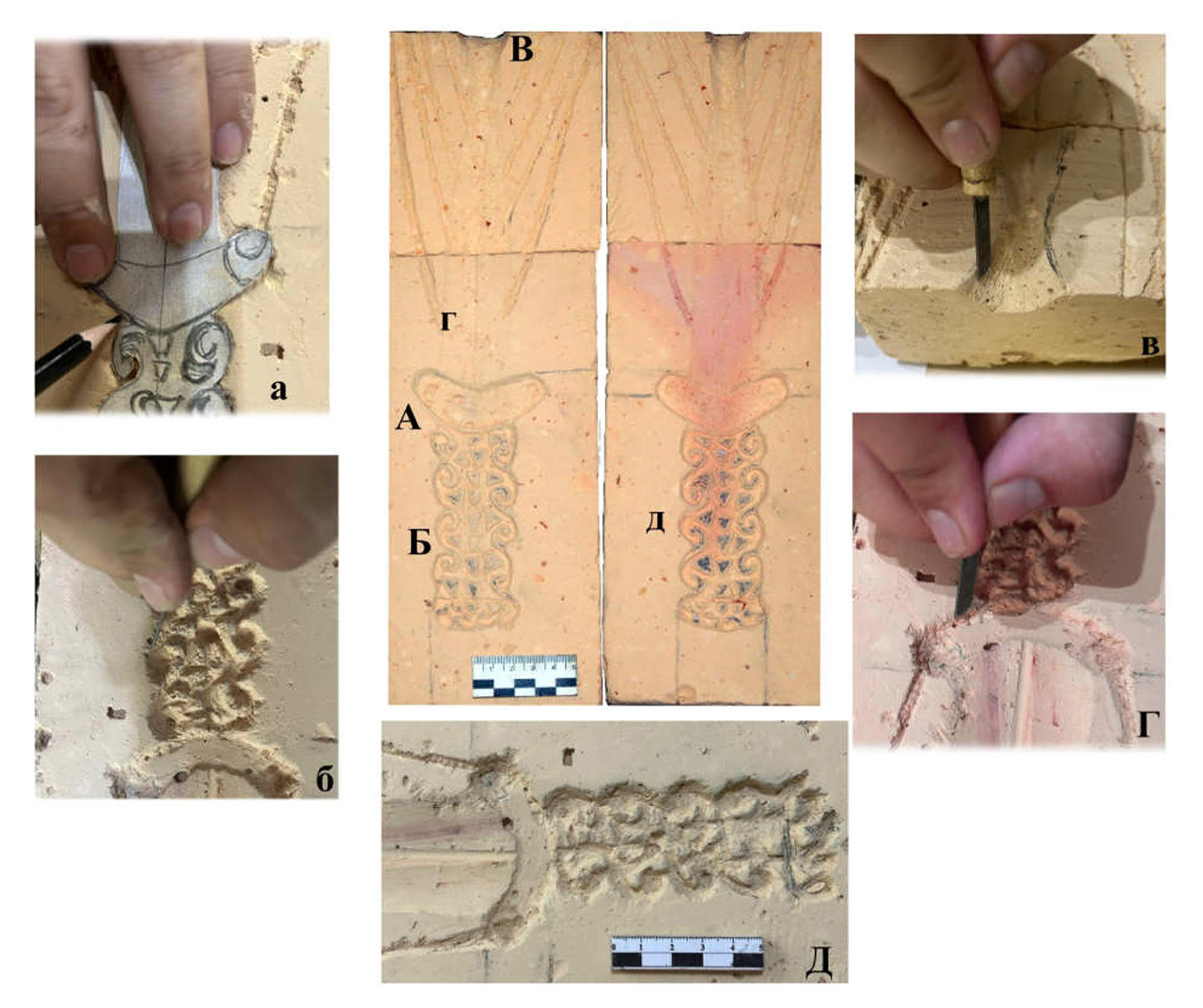 Кирпич оказался несколько короче кинжала, так что каждую створку пришлось «склеивать» около двух часов. Чтобы вырезать формы, использовали распечатанные изображения кинжала в натуральную величину – по ним переносили сначала основные элементы оружия, а потом и орнамент. Для резки использовались железные инструменты, что вполне допустимо: в V веке до н.э. уже хорошо были известны изделия из этого металла. Потом форму заглаживали наждачной бумагой, это тоже допустимо: шлифовка известна ещё с периода мезолита. Створки совмещали с помощью специальных рисок на формах.