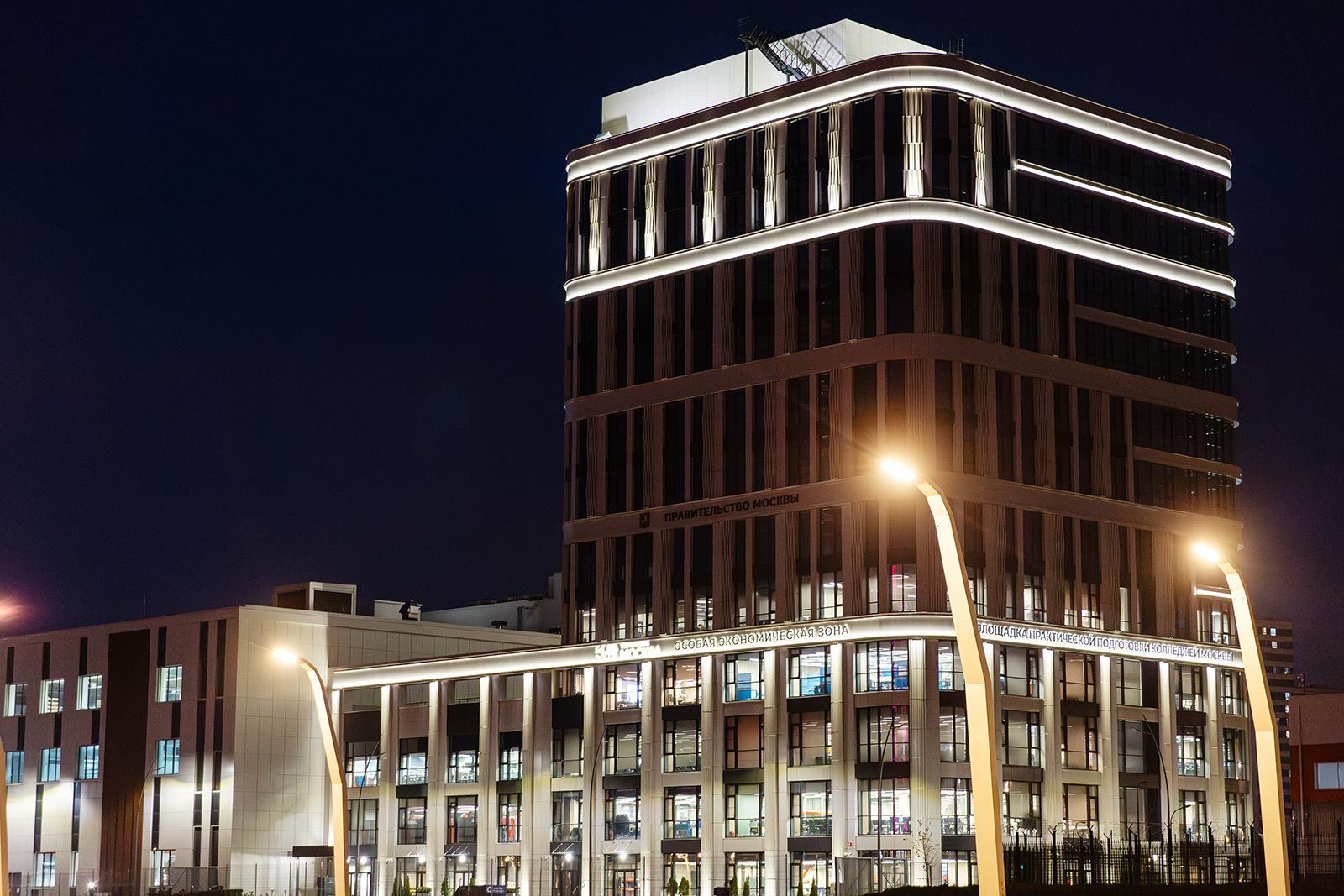 «По поручению Сергея Собянина активно продолжается работа по развитию социальной инфраструктуры в особой экономической зоне “Технополис Москва” и ее интеграции в городскую среду. Уже открыт уникальный спортивно-досуговый комплекс на площадке “Алабушево” и рекреационная зона в индустриальном парке “Руднево”. Здесь мы также реализовали проект архитектурной подсветки, которая сделает здания площадки еще выразительнее в вечернее и ночное время», — рассказал Максим Ликсутов.В освещении корпуса практической подготовки студентов столичных колледжей использовали белые светодиодные фонари. Фасад производственного корпуса подчеркнули красно-синей и белой подсветкой, а общественно-деловой центр украсили разноцветными лампами. Работы выполняла столичная компания «МСК “БЛ Групп”».