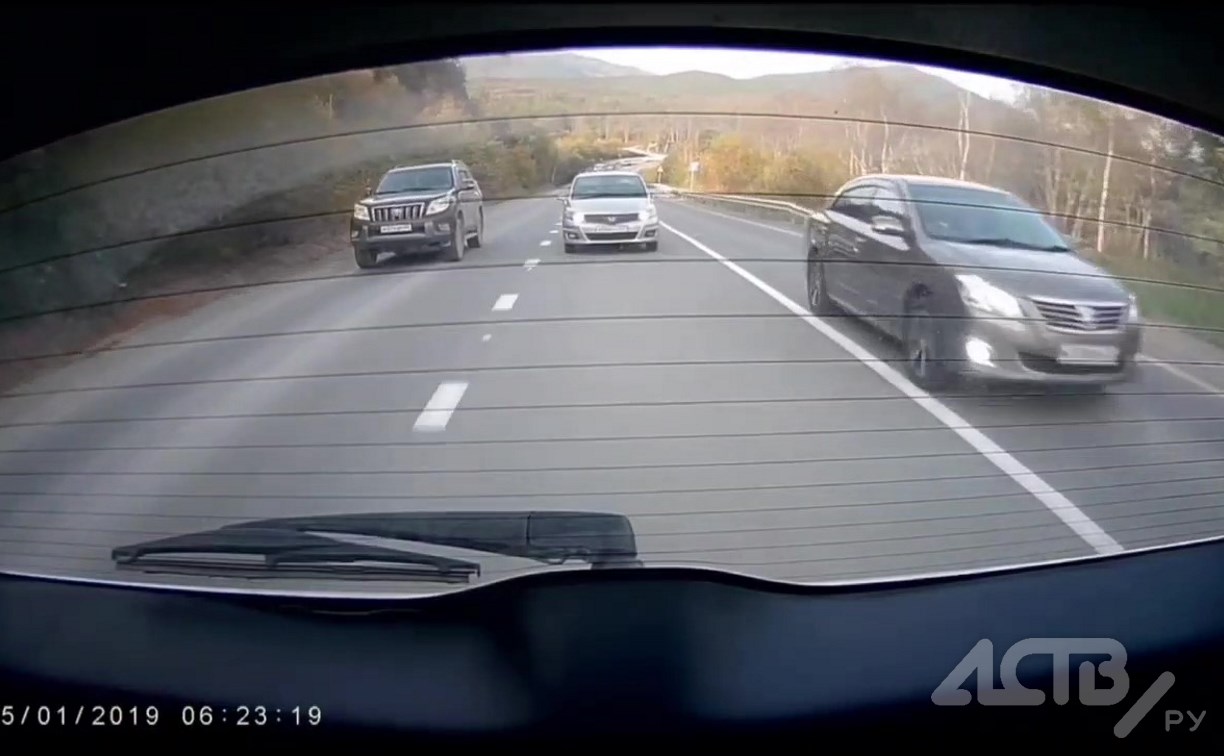 Автомобиль жёстко подрезали перед "слепым" поворотом на охотской трассе