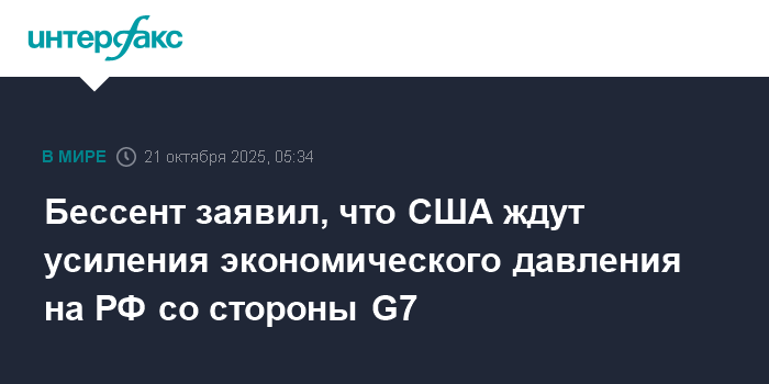 Бессент заявил, что США ждут усиления экономического давления на РФ со стороны G7