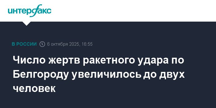Москва. 6 октября. INTERFAX.RU - Умер мирный житель, пострадавший при украинском обстреле Белгорода, сообщил губернатор региона Вячеслав Гладков.