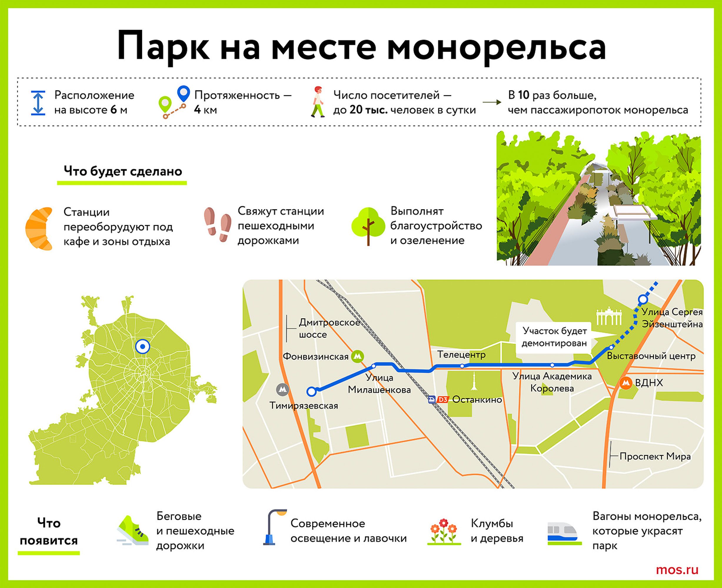 «Началась разработка проекта планировки территории под круглогодичный прогулочный парк, который появится на месте устаревшей инфраструктуры монорельса на высоте шесть метров. Согласно разрабатываемому проекту, новая зона отдыха площадью около 40 тысяч квадратных метров и протяженностью четыре километра свяжет прогулочным маршрутом несколько парковых пространств от Главного ботанического сада имени Н.В. Цицина Российской академии наук до Тимирязевского парка. Там планируют обустроить прогулочные зоны и сопутствующую инфраструктуру, а пять из шести бывших станций монорельса преобразовать в общественные пространства с кафе, ресторанами и выставочными залами. Для обеспечения доступности парка будет создано восемь дополнительных спусков», — рассказал Владимир Ефимов.Монорельс построили более 20 лет назад. Он давно перестал полноценно выполнять транспортную функцию. Во время комплексного обследования его технического состояния специалисты выявили необходимость в капитальном ремонте. Опираясь на эти данные, Научно-исследовательский институт «Мостранспроект» предложил превратить устаревшую конструкцию в современный круглогодичный зеленый парк.