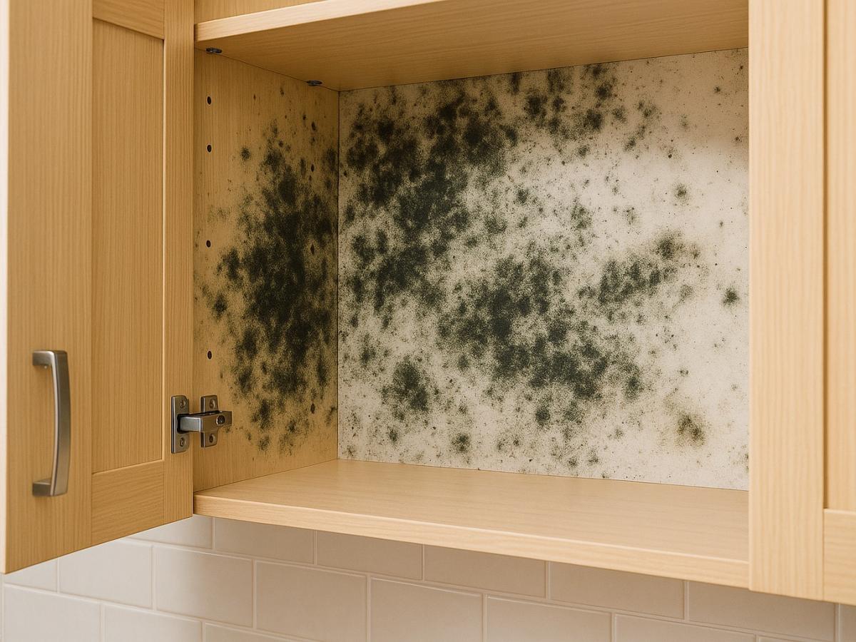 Фото: Generated by AI (DALL·E 3 by OpenAI) is licensed under Free for commercial use (OpenAI License) Плесень в кухонном шкафу Почему в шкафах появляется плесеньОсновная причина — влажность. Когда воздух внутри плохо циркулирует, создаются идеальные условия для грибков и спор. Особенно часто проблема возникает в старых домах, у северных стен и в помещениях без отопления.