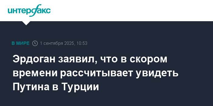 Москва. 1 сентября. INTERFAX.RU - Президент Турции Реджеп Тайип Эрдоган рассчитывает в скором времени увидеть в этой стране российского коллегу Владимира Путина.