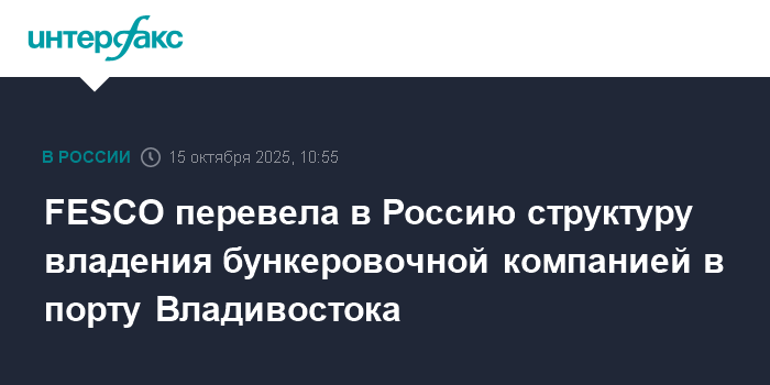Москва. 15 октября. INTERFAX.RU - Транспортная группа FESCO (головная компания ПАО "Дальневосточное морское пароходство", ДВМП) поменяла структуру владения бункеровочной компанией в порту Владивосток.