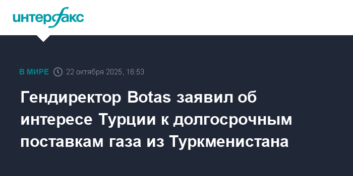 Москва. 22 октября. INTERFAX.RU - Турция, в марте начавшая получать газ из Туркменистана, заинтересована в долгосрочных и крупномасштабных поставках туркменского газа, заявил генеральный директор турецкой госкомпании Botas Абдулвахит Фидан в ходе международной конференции "Нефть и газ Туркменистана - OGT 2025". Об этом сообщает агентство News Central Asia.