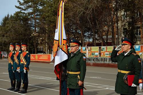 В ДВОКУ состоялась церемония вручения Георгиевских знаменных лент в честь присвоенного училищу почетного звания «гвардейское». Поздравить личный состав училища в Благовещенск приехал главнокомандующий Сухопутными войсками, Герой России, генерал-полковник Андрей Мордвичев.