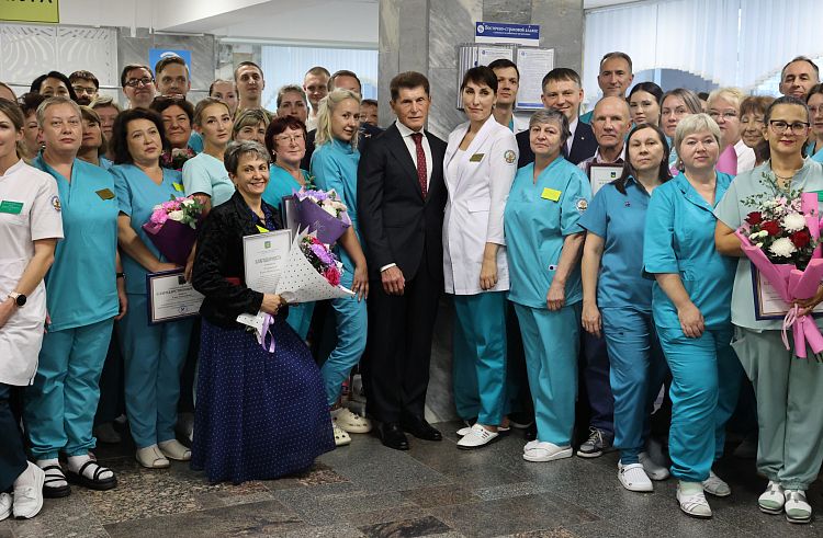 В качестве подарков сотрудникам Олег Кожемяко вручил почётные грамоты, благодарности и благодарственные письма. А завотделением анестезиологии и реанимации, врача-анестезиолога-реаниматолога Дмитрия Плоткина наградили Медалью «За особый вклад в развитие Приморского края» III степени.