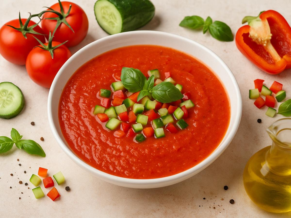 Фото: Generated by AI (DALL·E 3 by OpenAI) is licensed under Free for commercial use (OpenAI License) Томатный суп Гаспачо Продукты для рецептаПорции: 4