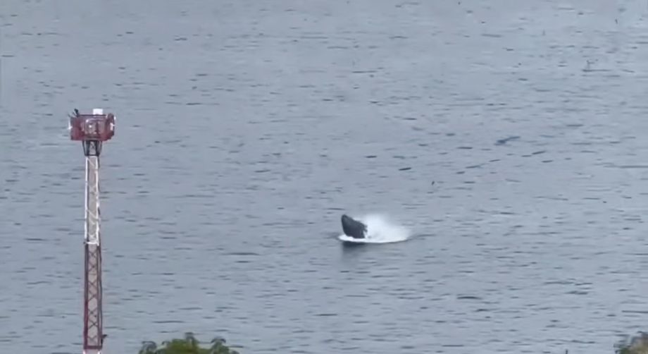 «Морской гигант», будто бы привыкший к вниманию, демонстрирует свои умения: грациозно пускает фонтаны воды и совершает эффектные прыжки.